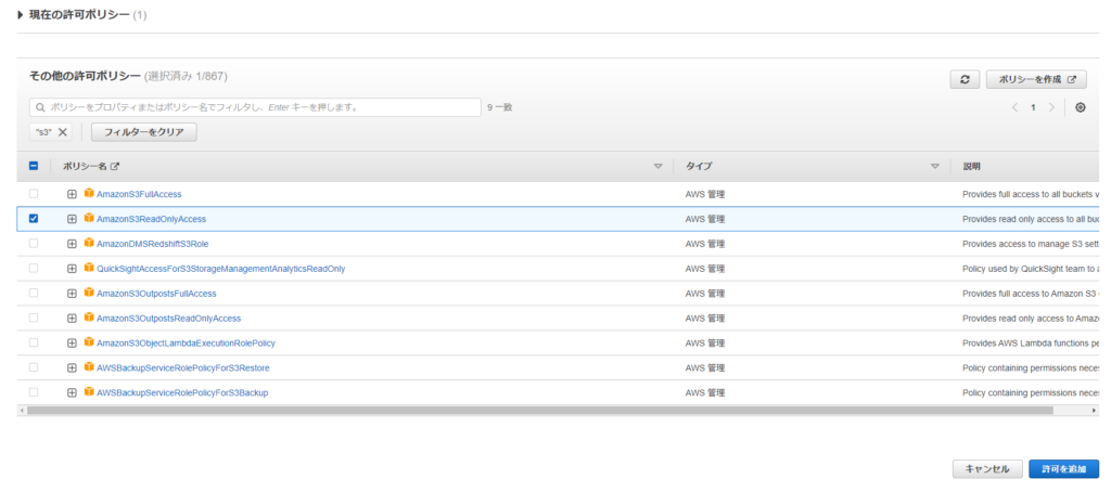 4.AmazonS3ReadOnlyAccess を選択し、”許可を追加”を押下