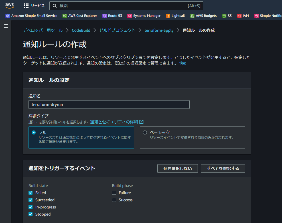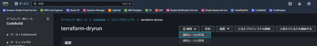 1.AWS にログインし対象のCodeBuildプロジェクトを開き、「通知」を押下