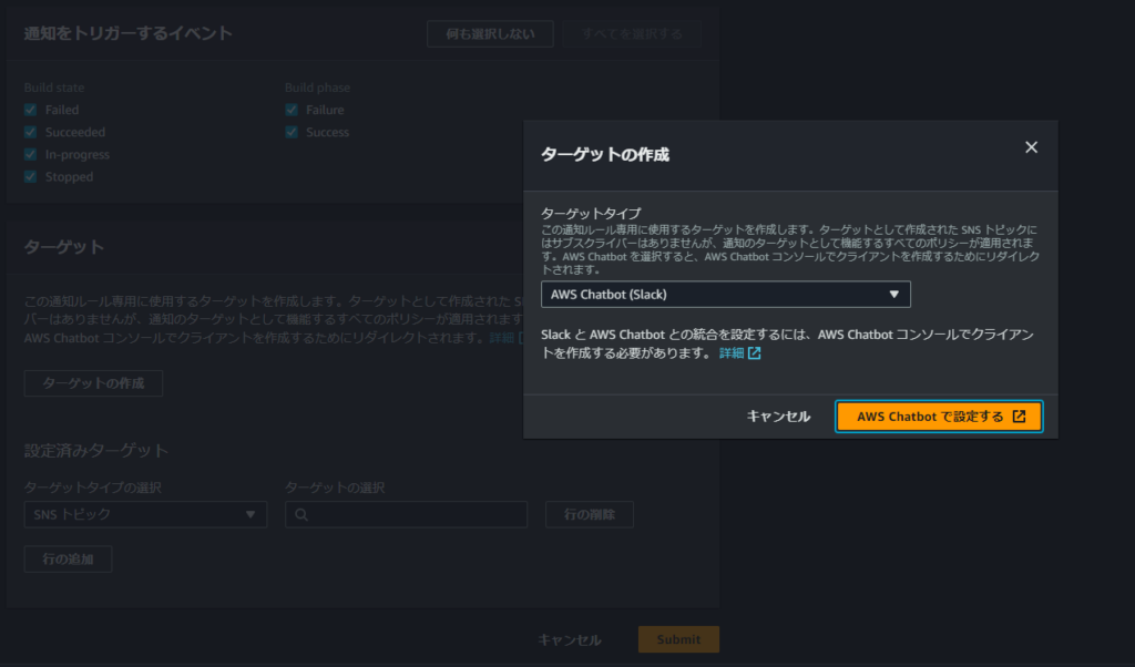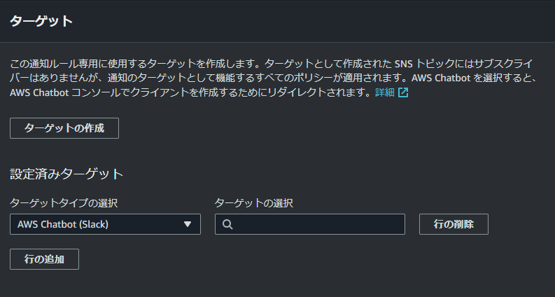 3.「ターゲットの作成」からターゲットタイプに「AWS Chatbot」を選択し「AWS Chatbotで設定する」を押下