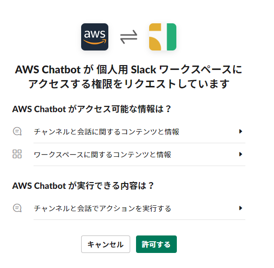5.作成したslackワークスペースのアクセス権限付与画面が出るので許可